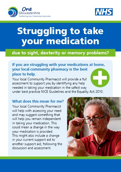 NHS Gloucestershire has produced guidelines to help to support you by identifying any help needed in taking your medication in the safest way under best practice NICE Guidelines and the Equality Act 2010.